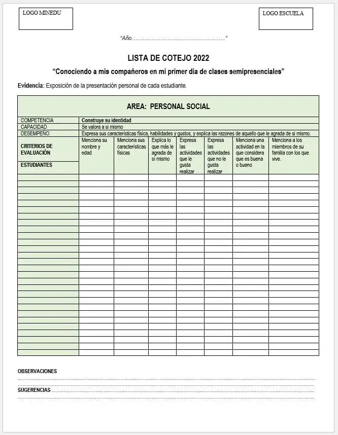 Lista de Cotejo para el Primer día de Clases 2022 (PRESENCIAL y SEMIPRESENCIAL-DISTANCIA) editables en formato word.
